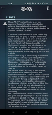 The weekly simultaneous play scenarios provide fantastic education and experience in dealing with societal collapse and all types of difficult decisions you must correctly make to stay alive. Learn about all areas of preparedness and collapse survival. Take the Apocalypse for a weekly test drive--see if you survive, and learn how to improve your odds. You can turn off the simulation message notices, but the real collapse warnings will still push through to your phone to warn you when a bad disaster is happening that could lead to a collapse. The extra hours of warning could save your life.